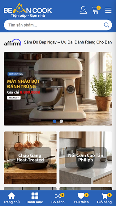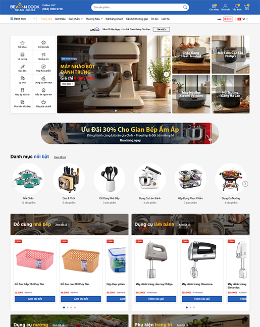 Bean Cook là giao diện hiện đại, tối ưu cho các cửa hàng đồ bếp, dụng cụ nấu ăn và thiết bị gia dụng...
